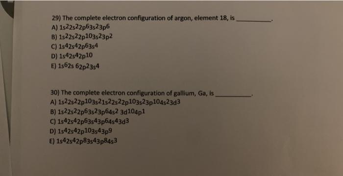 Mar 07, 2021 · electron configuration chart of all elements (full chart) june 10, 2021 march 7, 2021 by admin. The shorthand electron configuration (or noble gas configuration) as well as full electron configuration is also mentioned in the table. For writing the electronic configuration of elements, the aufbau principle is used. See full list on periodictableguide.com Jun 14, 2015 · its electron configuration is: In order to write the ar electron configuration we first need to know. Therefore the argon electron configuration will be 1s 2 2s 2 2p 6 3s 2 3p 6. rn 5f 14 6d 10 7s 2 7p 6. What is the electronic configuration of the noble gas argon, which has an atomic number of 18? The excited state electronic configuration is br− =ar4s24p6 b r − = a r 4 s 2 4 p 6. What is the electron arrangement for argon? 1s 2 2s 2 2p 6 3s 2 3p 6 4s 2 3d 10 4p 6 5s 2 4d 10 5p 6 6s 2 4f 14 5d 10 6p 6 7s 2 5f 14 6d 10 7p 6. Alternatively, write the symbol for the noble gas before an element (radon, in this case), and just add the extra information: